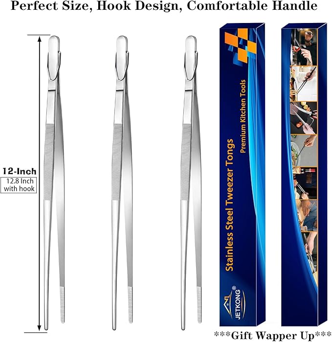 JETKONG 12-Inch Cooking Tweezer Tongs Food Tweezers for Kitchen and Barbecue, Set of 3 (12 12 12 Inch, Silver)
