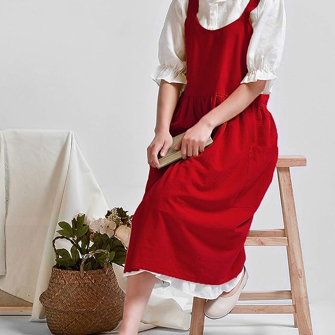 Uaussi Cotton Linen Apron Cross Back Work Apron for Women with Pockets Pinafore Dress X Cross Halter Apron for Chef Gardening