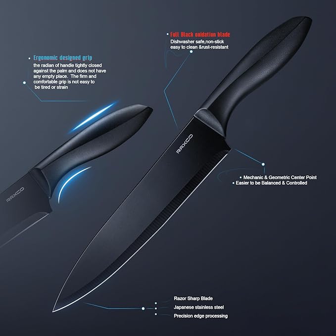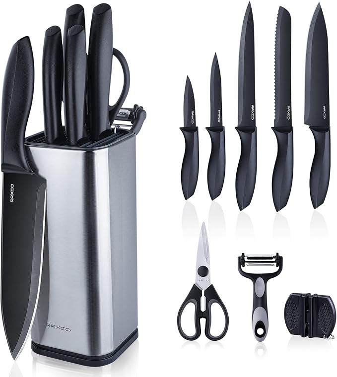 RAXCO Knife Set with Block,10-Piece Kitchen Knives Stainless Steel,Pro-sharpened for Cooking,Slicing,Mincing,Dicing,Black