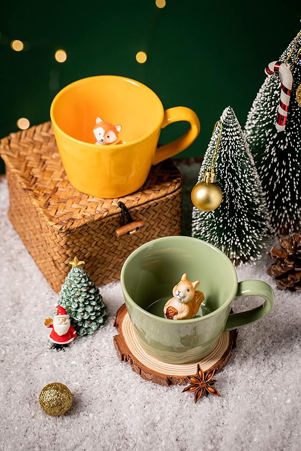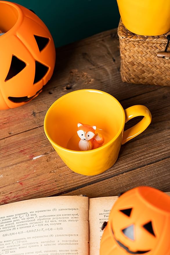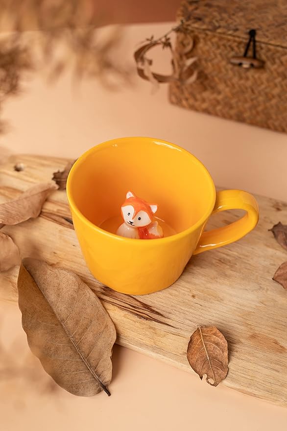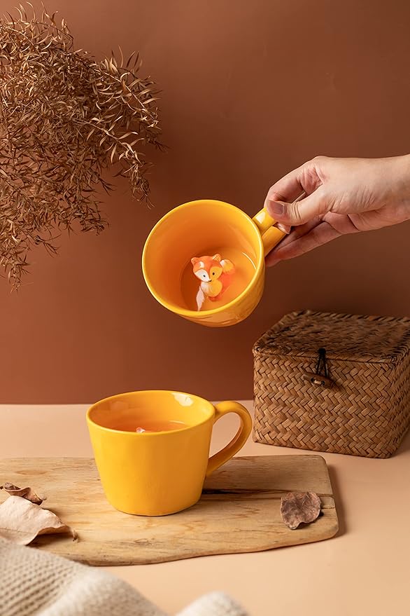 DIHOclub Fox Ceramic Cup Hidden 3D Animal Inside Mug,Cute Cartoon Handmade Figurine Mugs,Holiday and Birthday Gift for Coffee Milk Tea Lovers,12 OZ(Yellow)