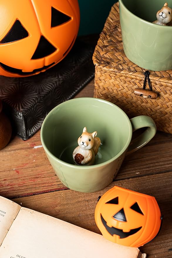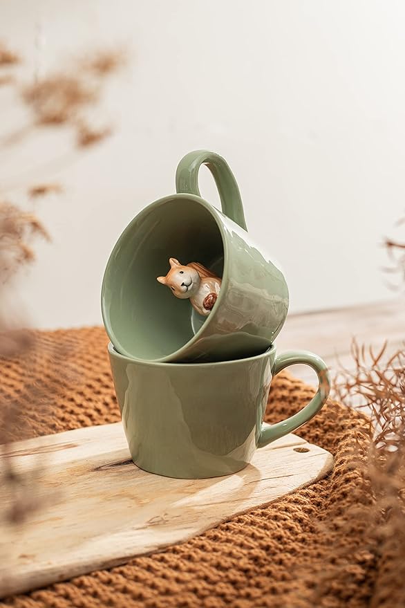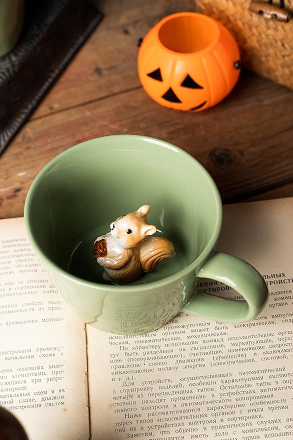 DIHOclub Squirrel Ceramic Cup Hidden 3D Animal Inside Mug,Cute Cartoon Handmade Figurine Mugs,Holiday and Birthday Gift for Coffee Milk Tea Lovers,12 OZ(Light Green)