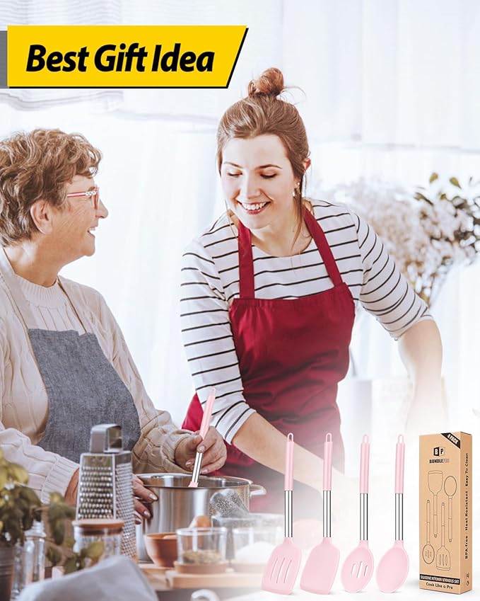 Pack of 4 Silicone Cooking Utensils Set, Non Stick Large Solid Spatulas, Heat Resistant Pink Slotted Spoons, Ideal BPA Free Kitchen Turners for Frying, Mixing,Serving,Draining,Turning,Stirring