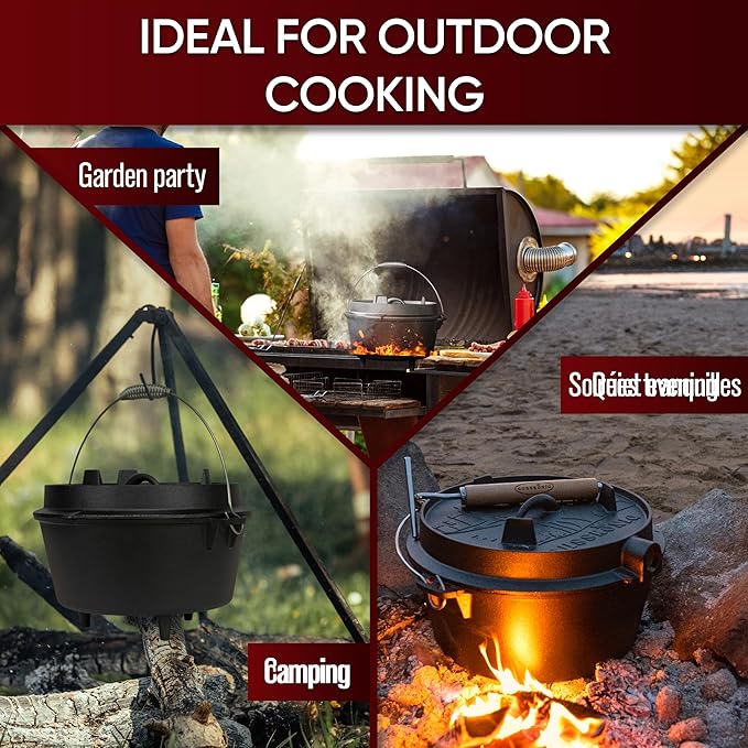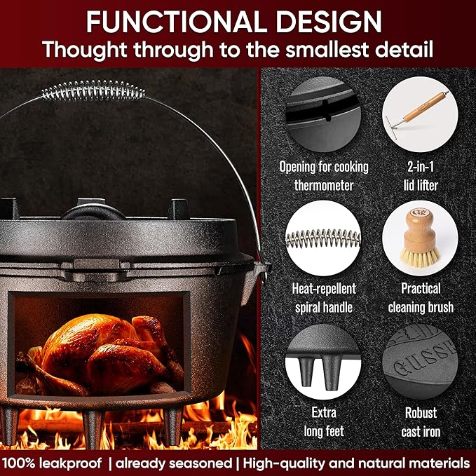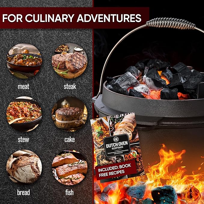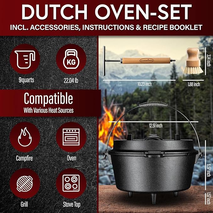 Pre-Seasoned Dutch Oven Set - 9 Quart Cast Iron Dutch Oven Pot with Lid, Fire Pot with Feet for Bread Baking & Cooking - Includes 2-in-1 Lid Lifter, Brush & Recipe Book [for 4-7 People]
