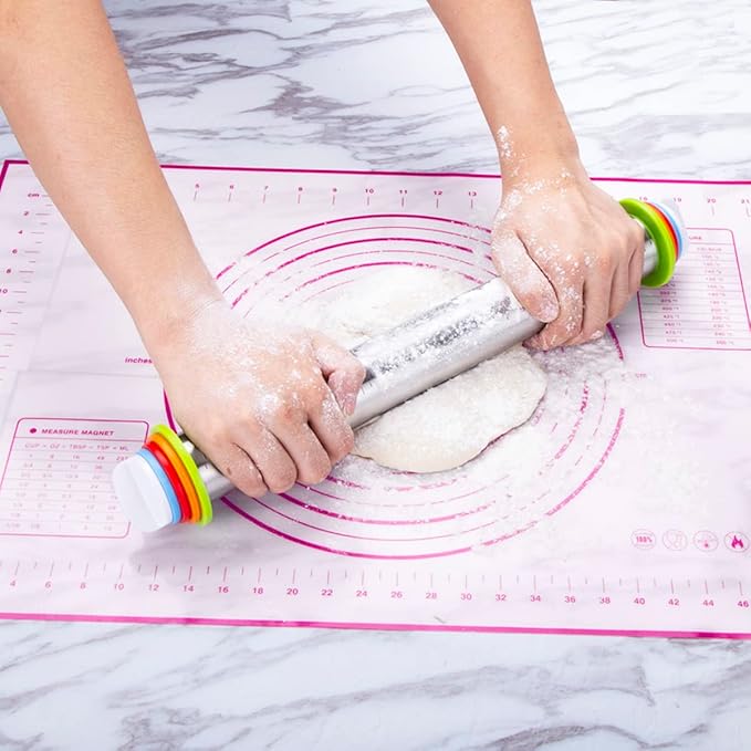 Rolling Pin and Pastry Baking Mat Set, Rolling Pins with Adjustable Thickness Rings, Stainless Steel Dough Roller for Baking Fondant, Pizza, Pie, Pastry, Pasta, Cookies (Purple)