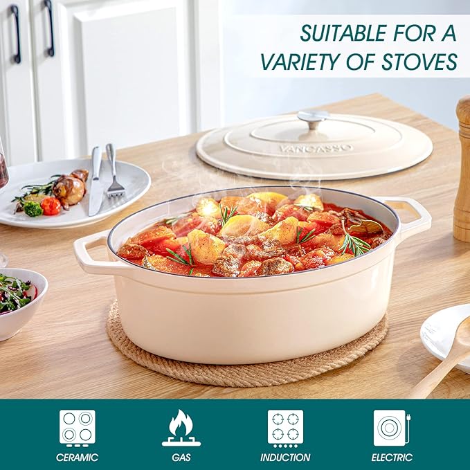 vancasso Enameled Cast Iron Dutch Oven, 9.3 Quart Dutch Oven Pot with Lid, Oval Cast Iron Pot with Non Stick Enamel Coating for Bread Baking, White