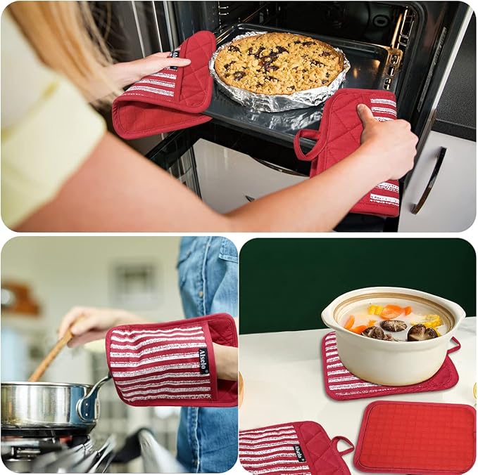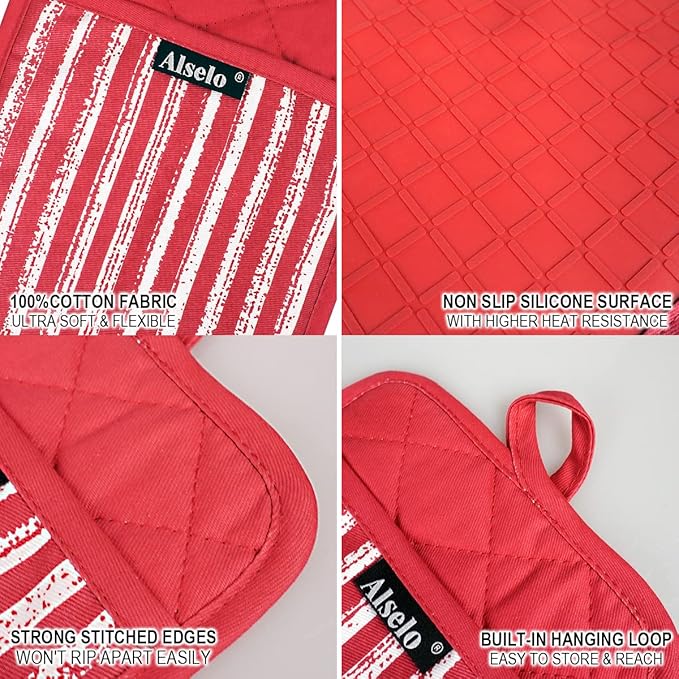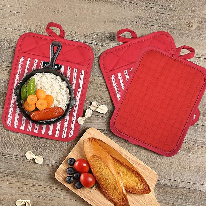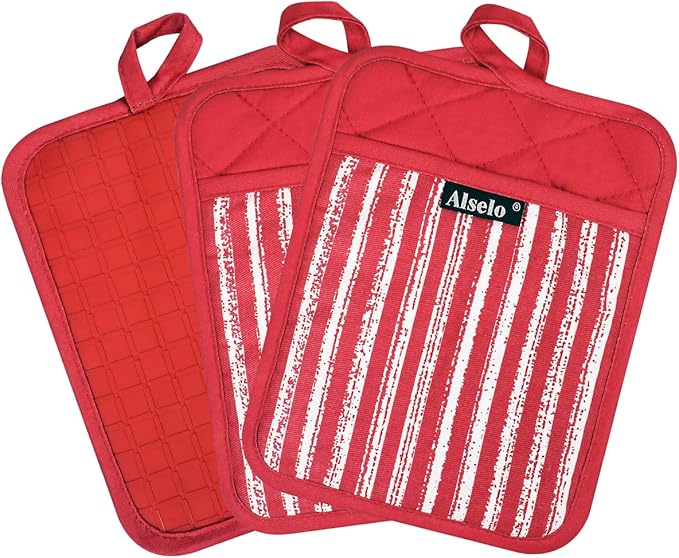 Silicone Pot Holders Set of 3 Heat Resistant & Non Slip Potholders, Professional Oven Hot Pads with Pockets Mitts for Kitchen Cooking Baking Barbecue (3, Red)