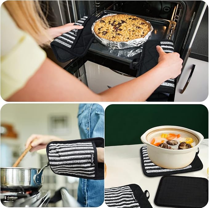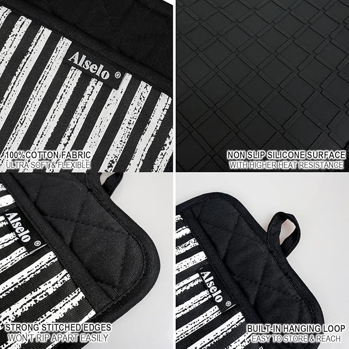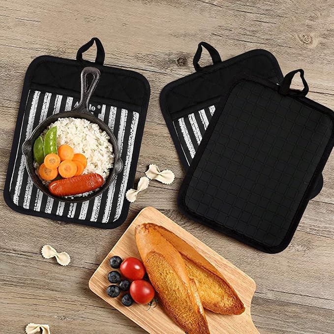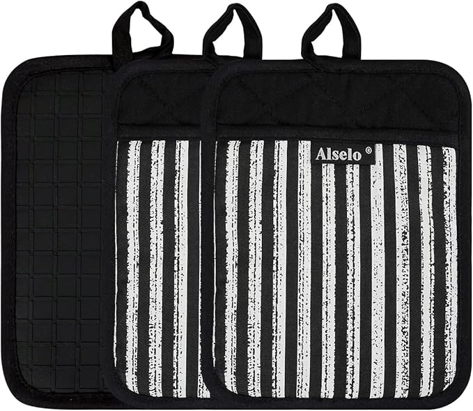 Silicone Pot Holders Set of 3 Heat Resistant & Non Slip Potholders, Professional Oven Hot Pads with Pockets Mitts for Kitchen Cooking Baking Barbecue (3, Black)