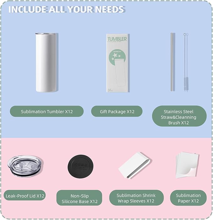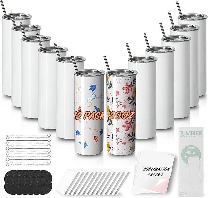 MURRICON Sublimation Tumblers 20 oz Skinny Straight,Stainless Steel Sublimation Blanks Skinny Tumbler,Double Wall Vacuum Insulated Tumblers,with lid and straw,12 Pack
