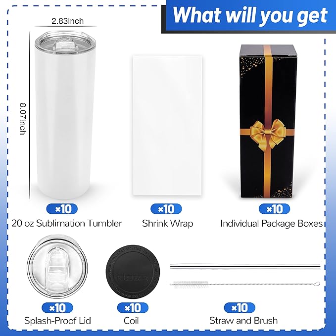 Joyclub Sublimation Tumblers Blanks 20 oz 10 Pack Skinny Straight Tumblers Bulk Stainless Steel Insulated Sublimation Cups with Lid and Straw, Gift Box
