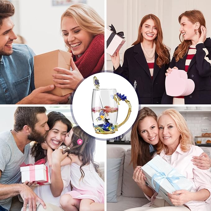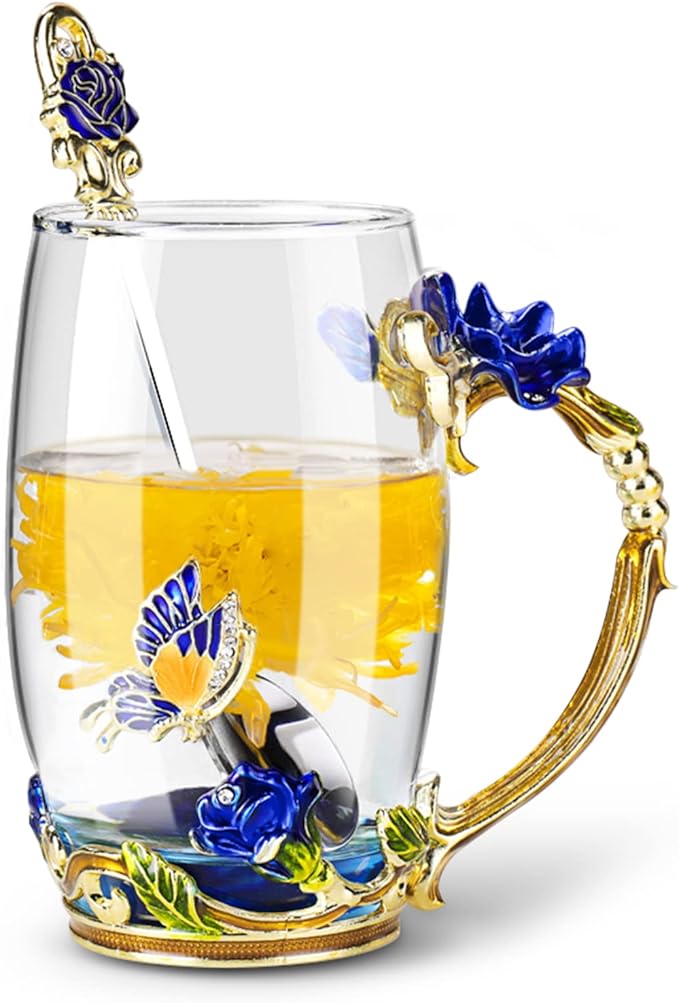 OEAGO Gifts for Mom Women Mothers Day Glass Coffee Enamels Mug Best Birthday Butterfly Rose Gifts for Her from Daughter Son Lead-Free Christmas Blue Tea Cup with Spoon Set