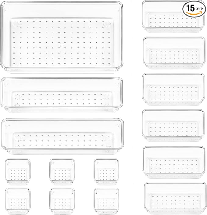 Vtopmart 15 PCS Clear Plastic Drawer Organizers Set, 4-Size Versatile Bathroom and Vanity Organizer Trays, Non-Slip Storage Containers for Makeup, Jewelries, Bedroom,Kitchen Utensils and Office