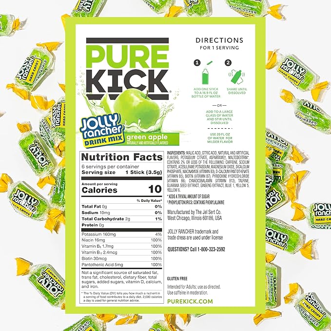 PURE KICK Energy Singles To Go Drink Mix, Jolly Rancher Green Apple, Includes 12 Boxes with 6 Packets in each Box, 72 Total Packets