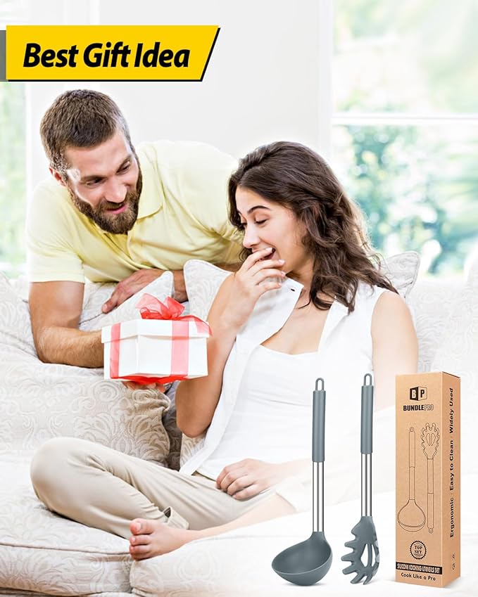Silicone Pasta Fork and Ladle Spoon Set, Large Non Stick Kitchen Utensils for Cooking,Stirring,Serving Spaghetti, Soup, Sauce (GRAY)