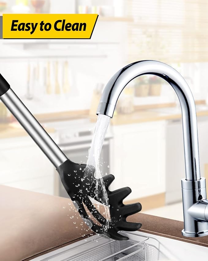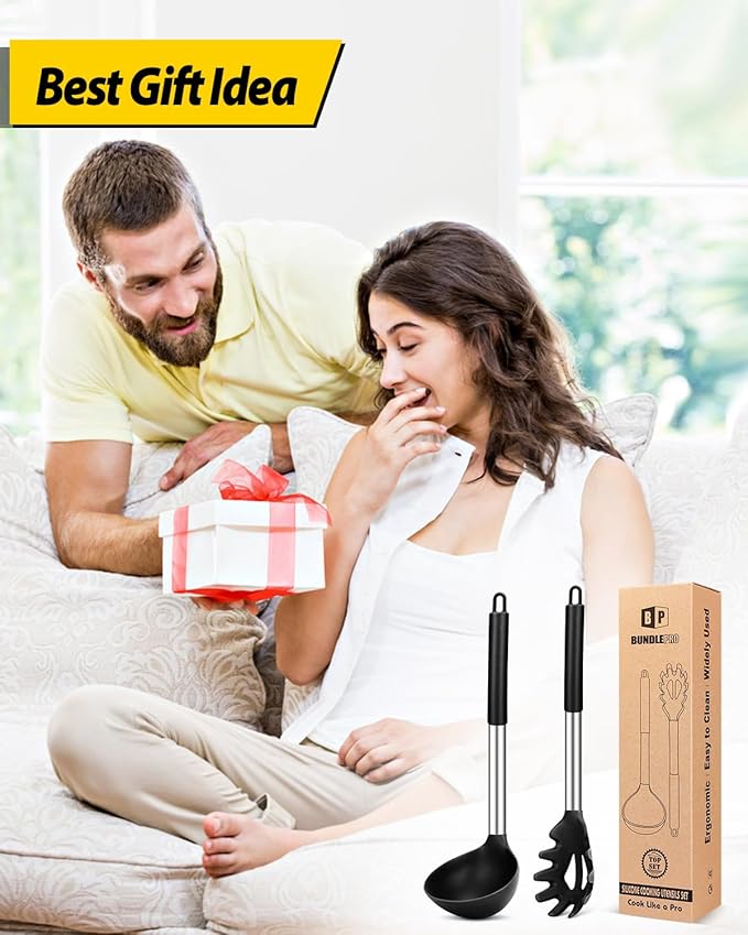 Silicone Pasta Fork and Ladle Spoon Set, Large Non Stick Kitchen Utensils for Cooking,Stirring,Serving Spaghetti, Soup, Sauce (BLACK)
