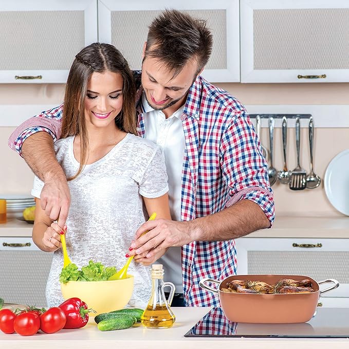 Moss & Stone 7 Pcs Copper Chef Cookware Non Stick Deep Frying Pan 9.5" x 3.5", Fry Basket, Dishwasher & Oven Safe, 5 Qt Deep Square Pot, Non Stick Pan & Round Pot, Induction Copper Cookware Set