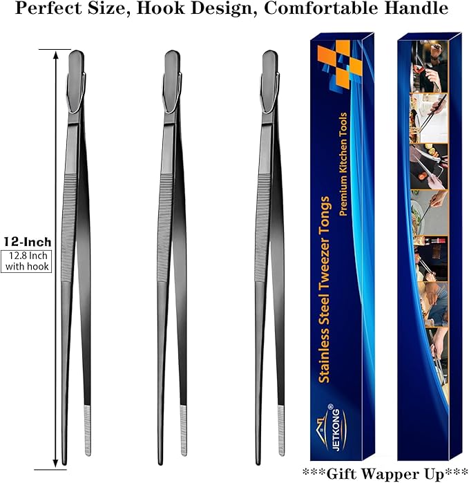 JETKONG 12-Inch Cooking Tweezers Tongs Precision Serrated Tips Stainless Steel Chef Tweezer, Set of 3 (12 12 12 Inch, Black)
