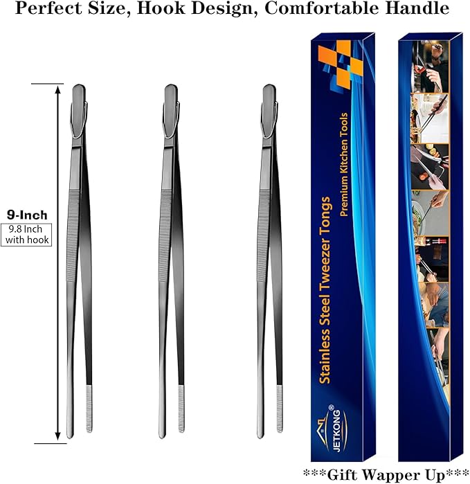 JETKONG 9-Inch Serving Tweezer Tongs Kitchen Tweezers Stainless Steel Cooking Tweezers, Set of 3 (9 9 9 Inch, Black)