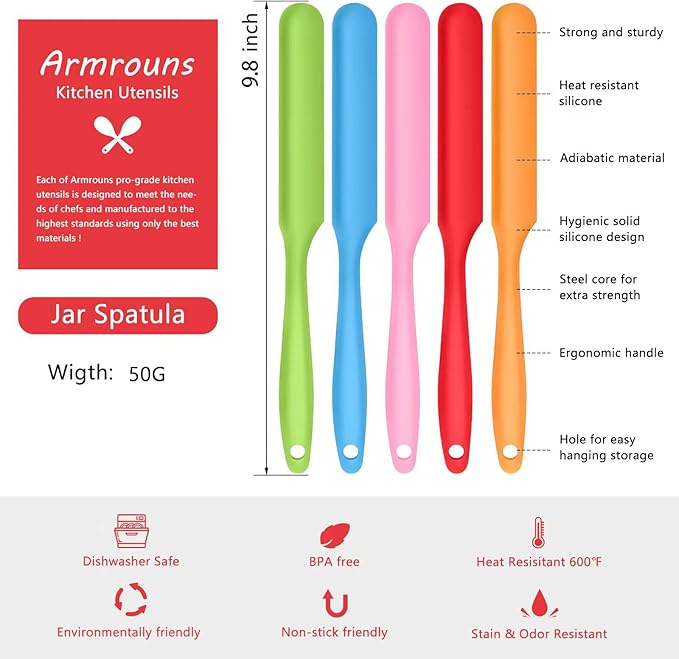 5pcs Silicone Jar Spatulas set, Cake Cream Spatulas Set, 9.8 inch Non-Stick Heat Resistant Mixing Butter Spatulas Baking Scrapers for Jars Blenders Cooking Stirring
