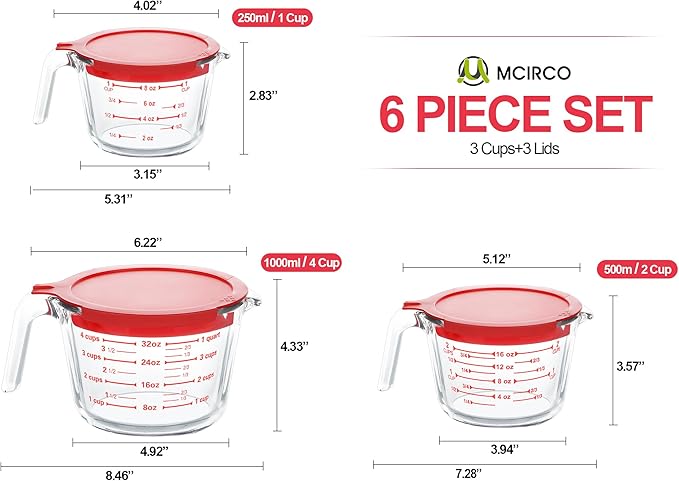 M MCIRCO 6 Pcs Glass Measuring Cups with Lids Set, 1-Cup, 2-Cup, 4-Cup Measuring Jugs with Handle, Nesting Liquid Measuring Cups for Kitchen
