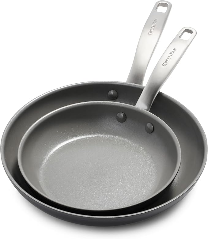 About This COOKWARE SET INCLUDES: 10” Frying Pan and 12” Frying Pan. REINFORCED WITH DIAMONDS: Metal utensil safe, GreenPan's diamond-infused... Read more
