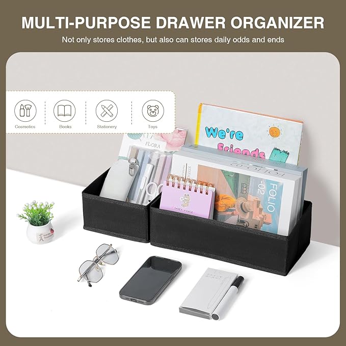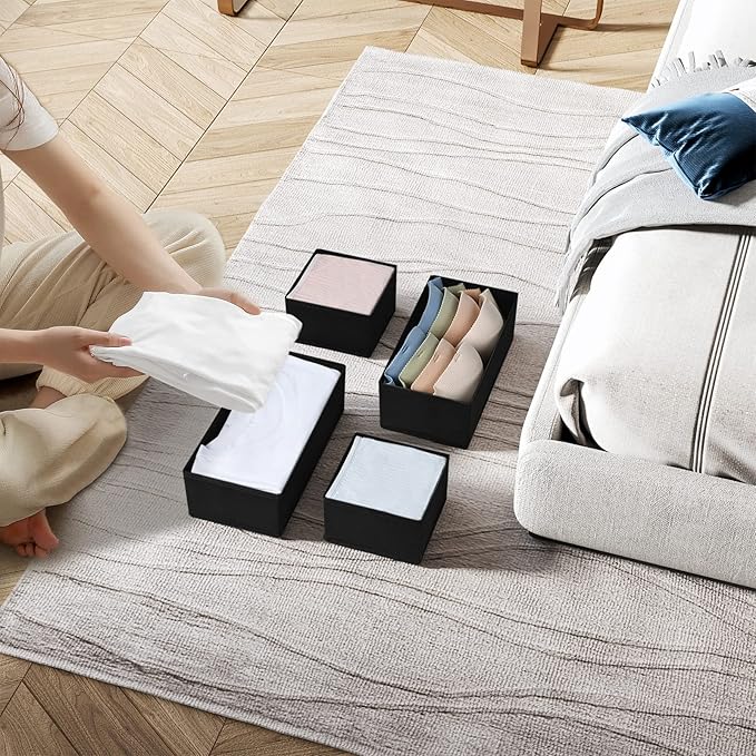 DIMJ Drawer Organizers - Set of 4 Foldable Closet Dividers for Baby Clothes, Socks, Belt, Tie (Black)