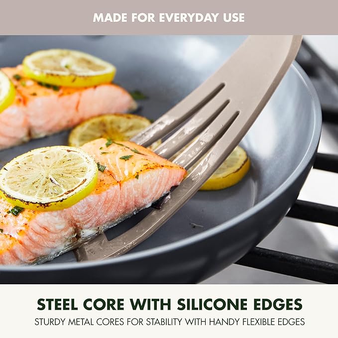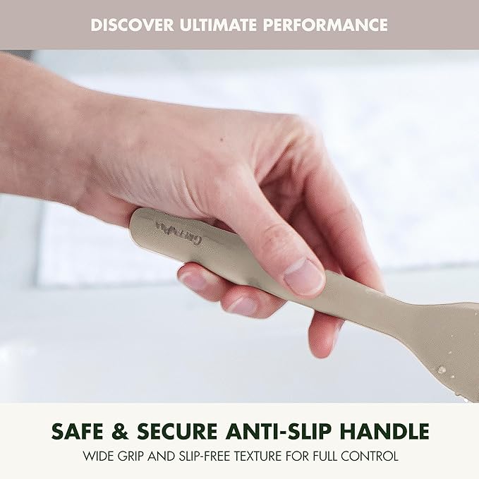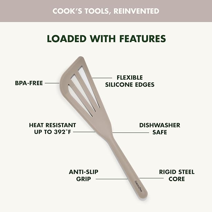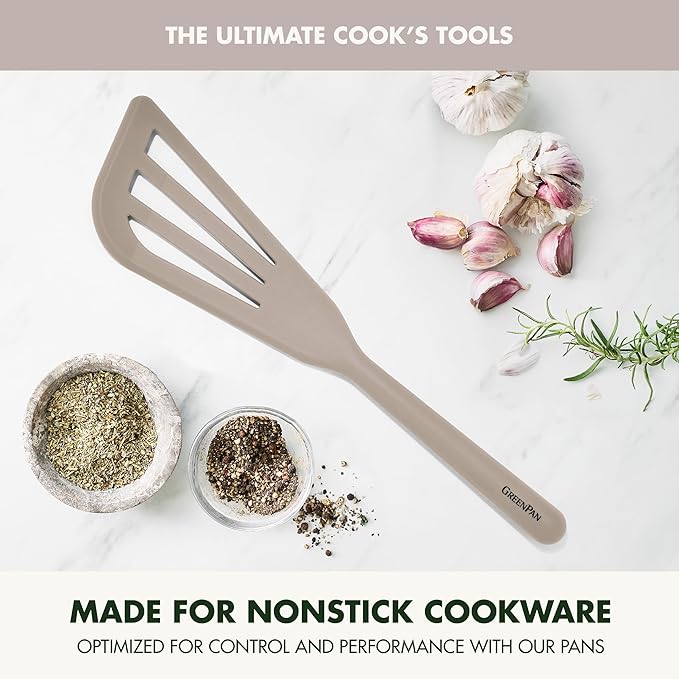 GreenPan Silicone Fish Turner Spatula, Slotted Cooking Kitchen Utensil, Flexible Rubber Nonstick Cookware, Rigid Steel Core, Heat-Resistant, Anti-Slip Handle, BPA-Free, Dishwasher Safe, Taupe