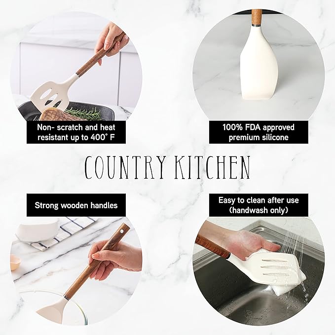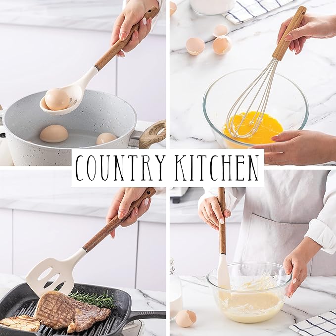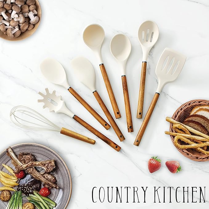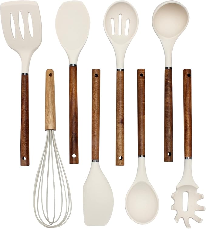 Country Kitchen Non Stick Silicone Utensil Set with Rounded Wood Handles for Cooking and Baking, 8 Piece Set, Khaki