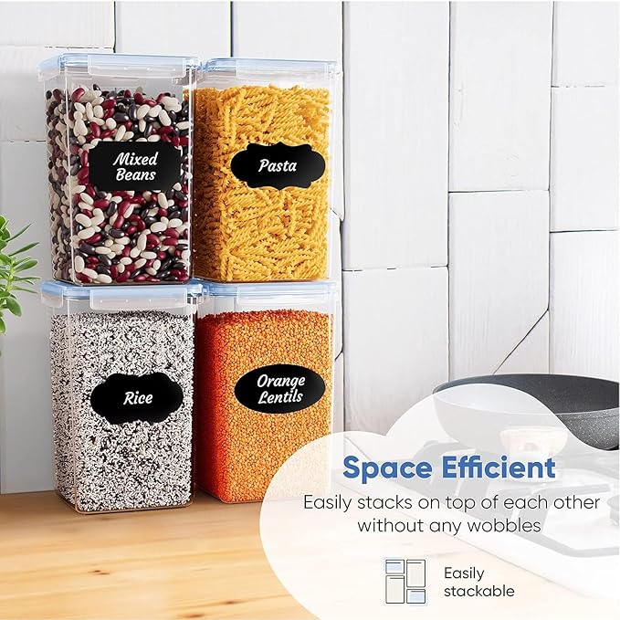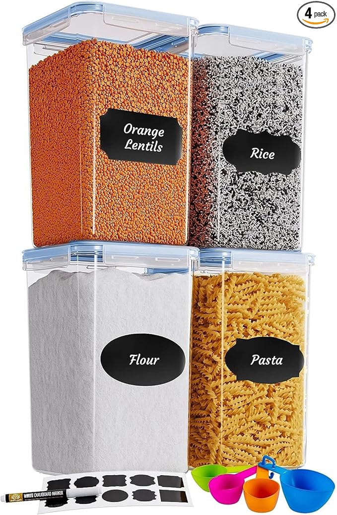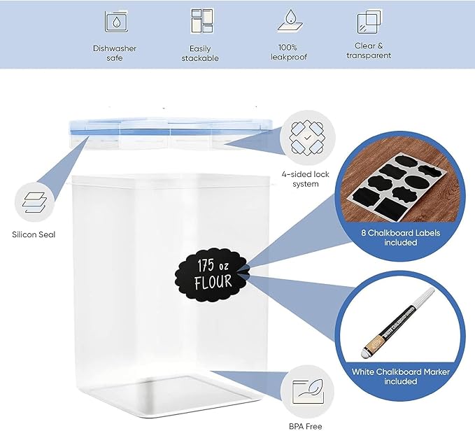 Chef's Path Extra Large Airtight Food Storage Containers with Blue Lid Color, Pack of 6, Kitchen and Pantry Canisters for Flour, Sugar, and Baking Supplies, Includes Measuring Spoons, Labels, and Pen