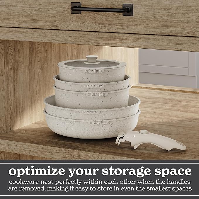 Country Kitchen Cookware Set with Removable Handle, Oven & RV Safe Pots and Pans Set, Cream, Original