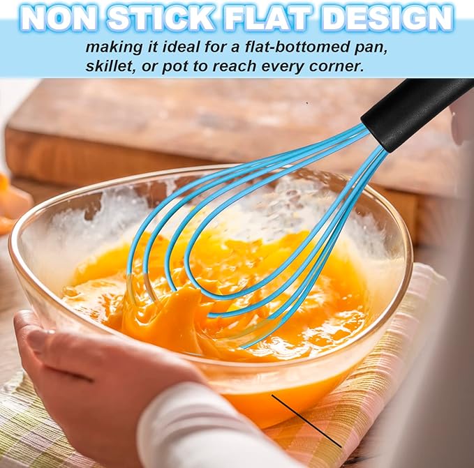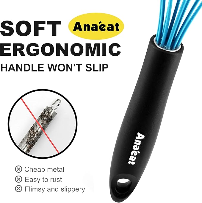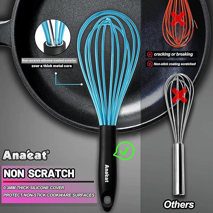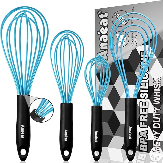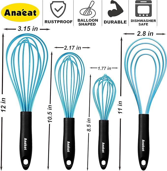 Anaeat Silicone Kitchen Whisk Set of 4, Perfect for Non-Stick Cookware, Milk and Egg Beater Blender for Whisking, Cooking, Baking, Beating - 11'' Flat Whisk and 8.5''+10.5''+12'' Balloon Whisks (Blue)