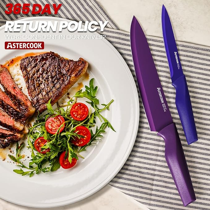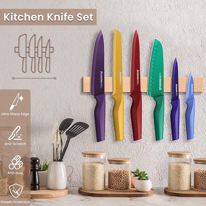 Astercook Knife Set, 12 Pcs Color-Coded Kitchen Knives Set, 6 Color Anti-Rust Coating Stainless Steel Chef Knife Sets with 6 Blade Guards Dishwasher Safe