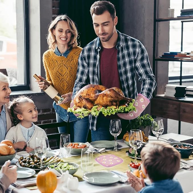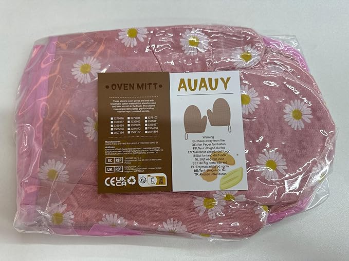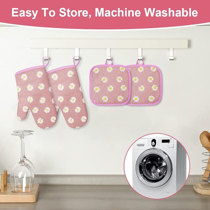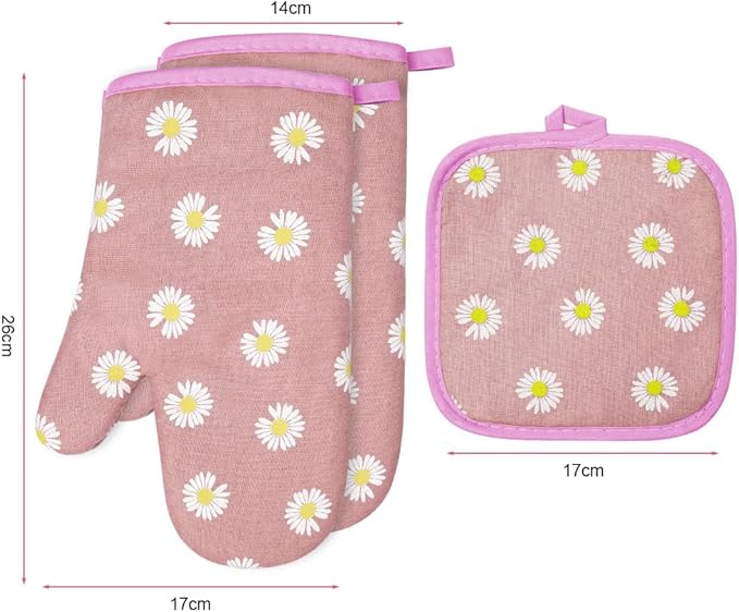 AUAUY Oven Mitts and Potholders, BBQ Gloves Heat Resistant, 1 Pair Oven Mitts and 2 Pot Holders, Cotton Non-Slip Cooking Gloves for Cooking Baking Kitchen Microwave Pizza(Daisy-Pink)