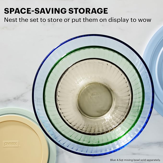 Pyrex Colors Tinted 4-PC, Medium/Large Glass Mixing Bowls With Lids, Nesting Space Saving Set of Bowls For Prepping and Baking, 2.3QT & 4.5QT