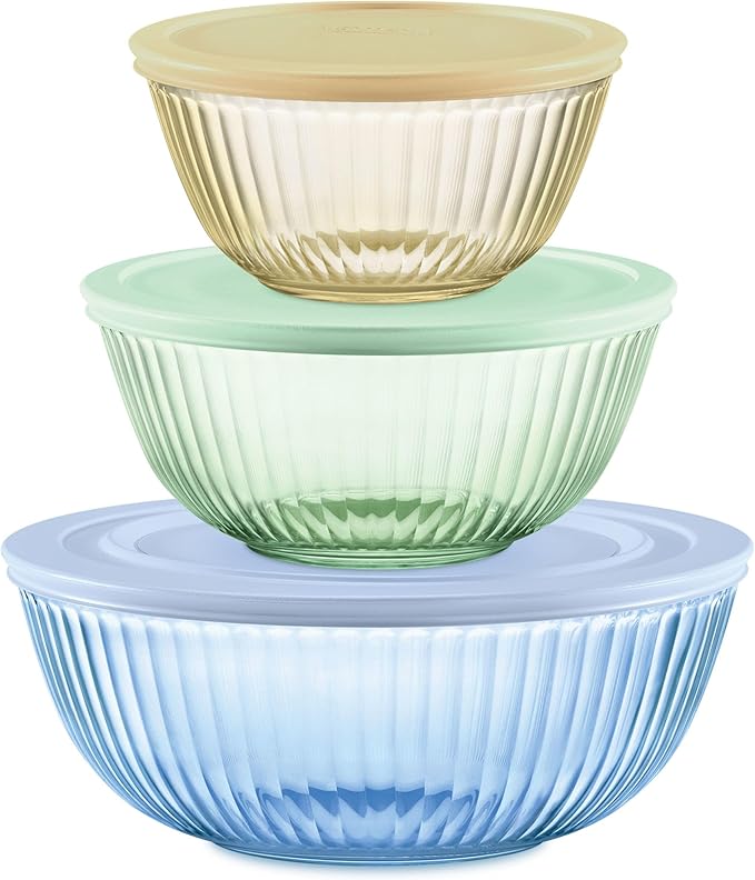 Pyrex Colors Tinted (3-Pack, Full Set) Sculpted Tinted Glass Mixing Bowls With Lids, Nesting Space Saving Set of Bowls For Prepping and Baking, 1.3QT, 2.3QT & 4.5Q