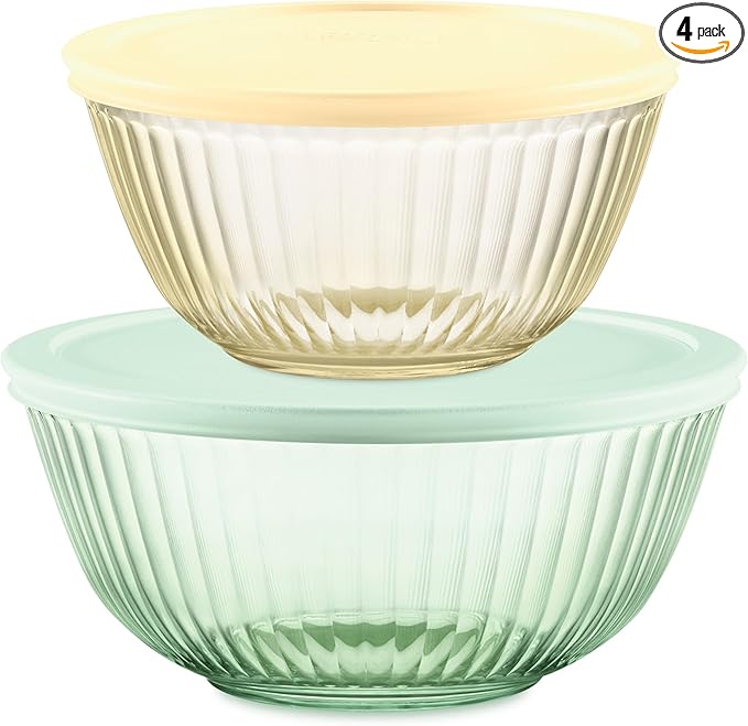 Pyrex Colors Tinted 4-PC, Small/Medium Glass Mixing Bowls With Lids, Nesting Space Saving Set of Bowls For Prepping and Baking, 1.3QT & 2.3QT