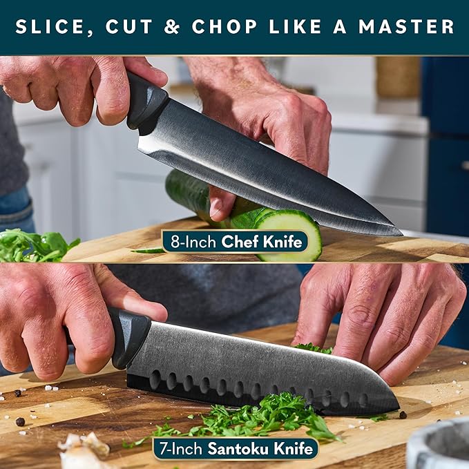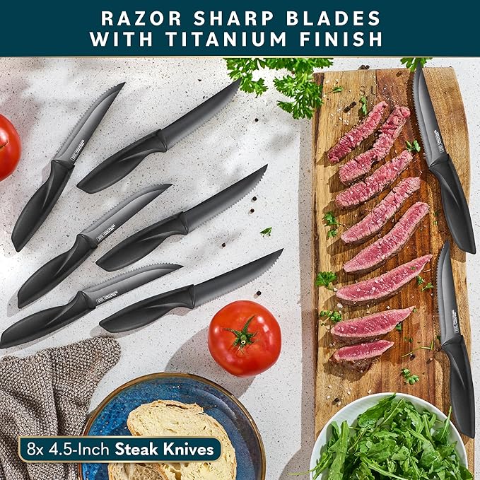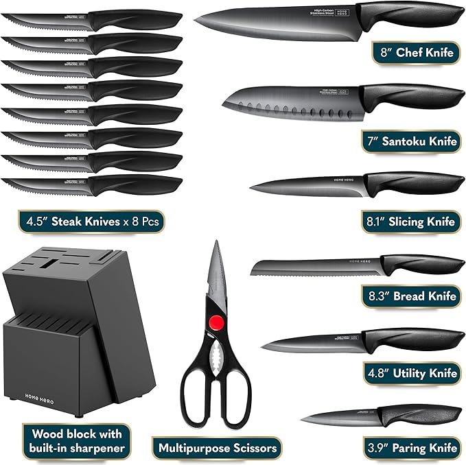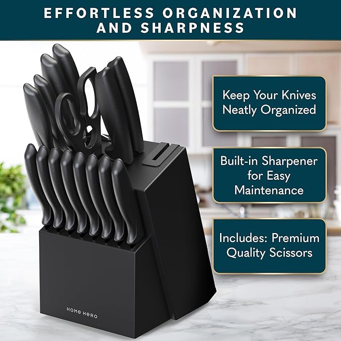 Home Hero Kitchen Knife Set - Wooden Knife Block Organizer - High Carbon Stainless Steel Blades - Ergonomic Handles with Built-In Sharpener & Kitchen Scissors - 16-Pc, Black
