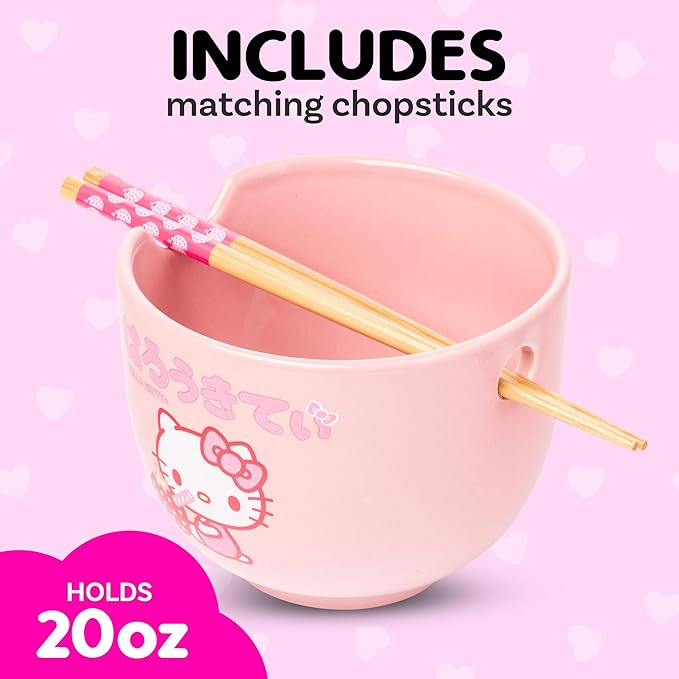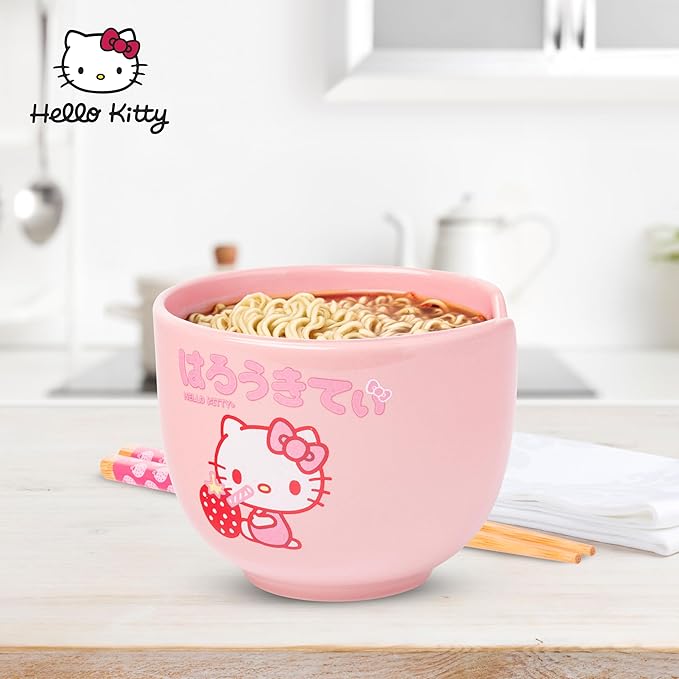 About This HELLO KITTY BOWL: Adorable pink ramen bowl features Hello Kitty drinking out of a cute strawberry and matching... Read more