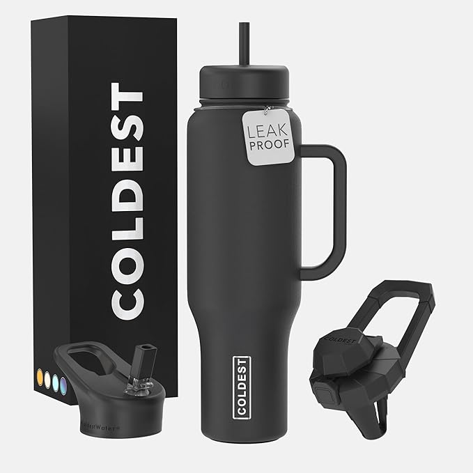 Coldest Tumbler with Handle and Straw - 100% Leak Proof Insulated Tumbler with Lid and Straw (3 Lids) - Stainless Steel Tumblers for Women & Men - Cup Holder Friendly Base, 46 oz (Stealth Black)