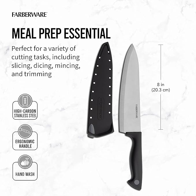 About This CUTLERY ESSENTIAL: This Farberware 8-inch Chef Knife with a sharpening blade cover is essential for your everyday food... Read more
