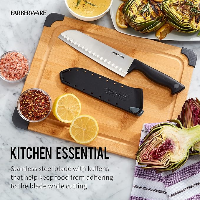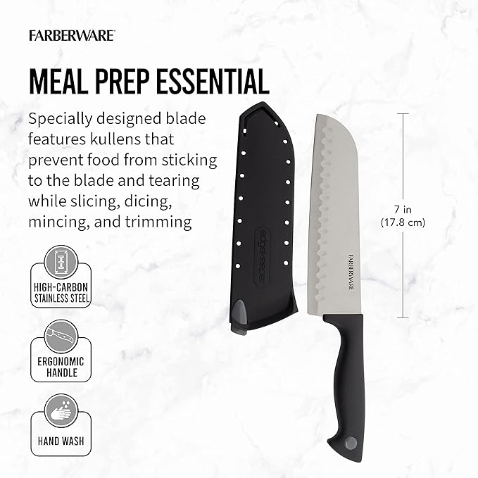 Farberware Edgekeeper 7-Inch Santoku Knife with Self-Sharpening Blade Cover, High Carbon-Stainless Steel Kitchen Knife with Ergonomic Handle, Razor-Sharp Knife, Black