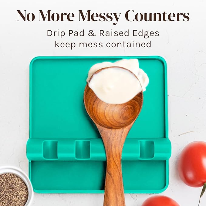 Aqua Green Silicone Spoon Rest for Stove Top with Drip Pad (Two Pack) - Heat-Resistant, BPA-Free Utensil Rest & Spoon Holder for Kitchen Counter - Grill Utensil Holder for Spatulas, Tongs, Ladles