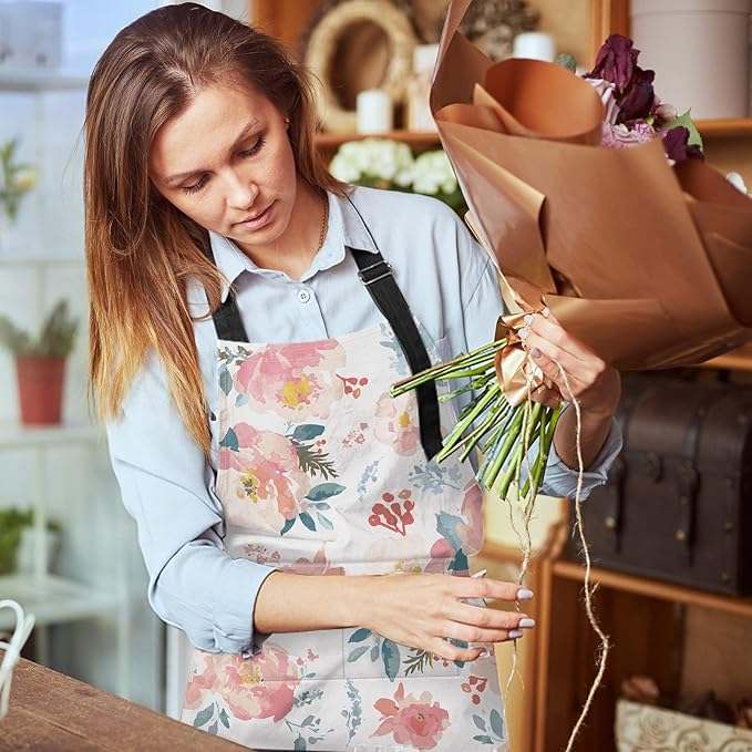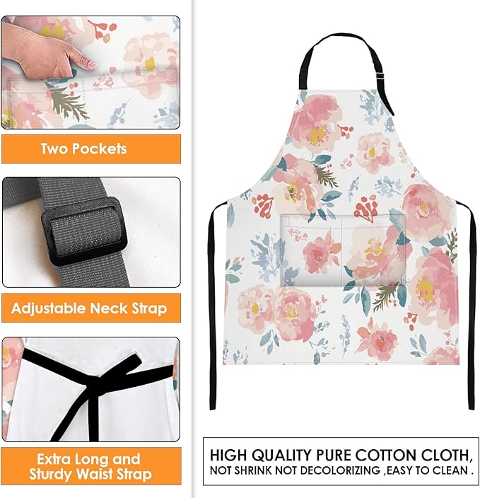 Britimes Apron Home Kitchen Cooking Baking Gardening for Women Men With Pockets Romantic Floral Flower Rose Pink 32x28 inch