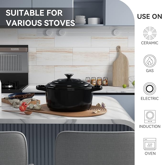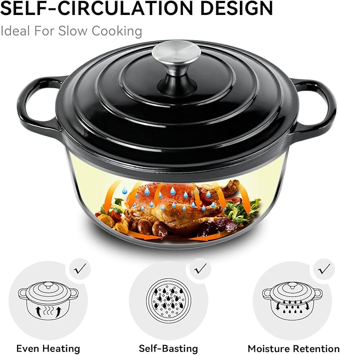 Miereirl 6 Quart Enameled Dutch Oven Pot with Lid, Cast Iron Dutch Oven with Dual Handles for Bread Baking, Cooking, Non-stick Enamel Coated Cookware (Black)