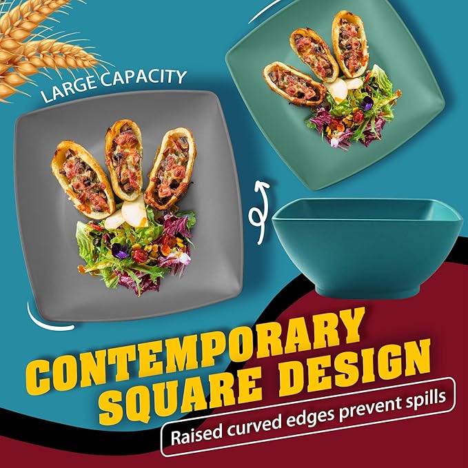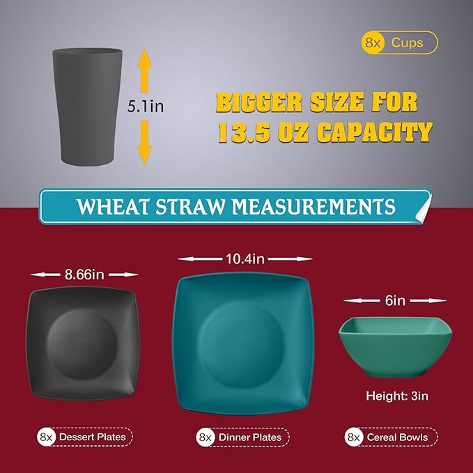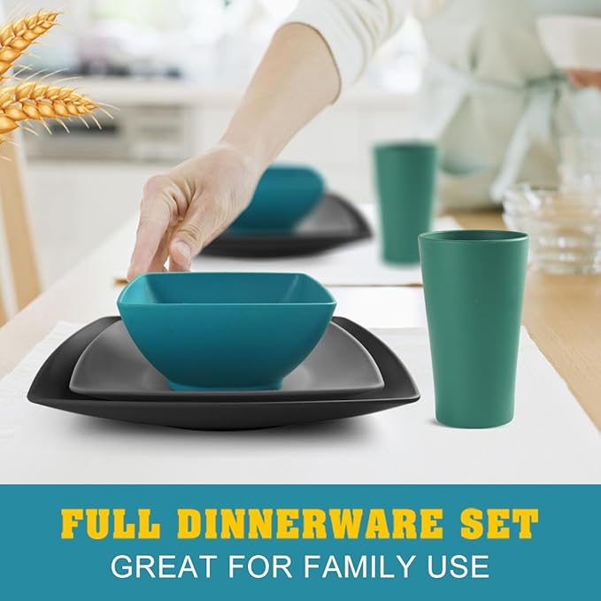 Teivio 32-piece Plastic Wheat Straw Square Dinnerware Set for 8, Unbreakable Dinner Plates, Salad Plates, Snack Bowls, Tumblers 20 oz, Dishwasher Safe, Coastal Multicolor