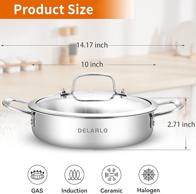 DELARLO Tri-Ply Stainless Steel 10 Inch Frying Pan 3QT Saute Pan With Lid Kitchen Skillets Induction Compatible Chef Cooking Pan Dishwasher & Oven Safe