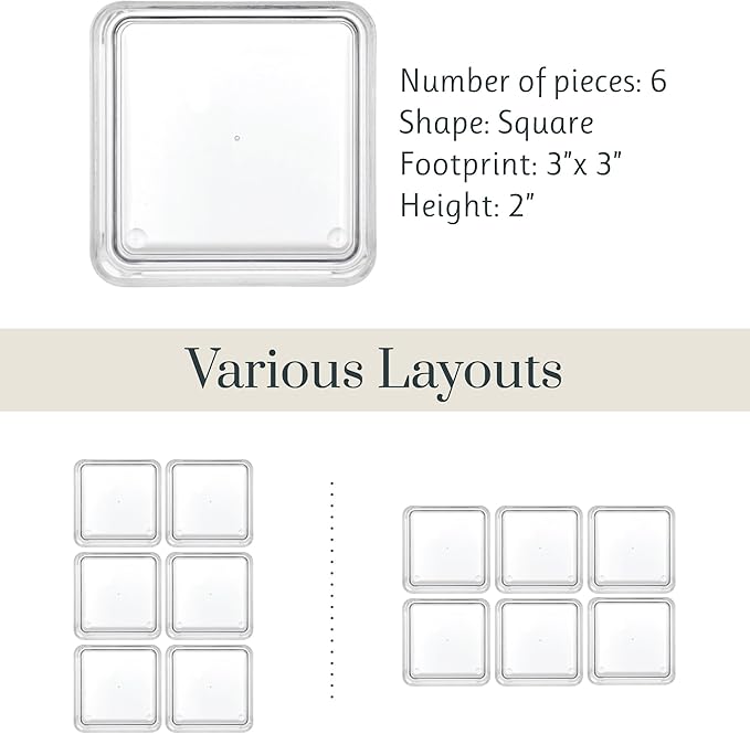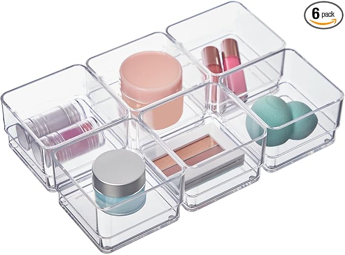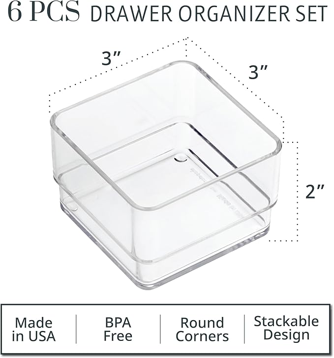 STORi SimpleSort 6-Piece Stackable Clear Drawer Organizer Set | 3" x 3" x 2" Square Trays | Small Makeup Vanity Storage Bins and Office Desk Drawer Dividers | Made in USA