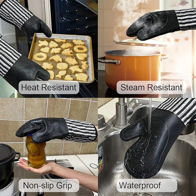 Silicone Oven Mitts Heat Resistant 932℉ with Waterproof & Non-Slip Kitchen Mittens, Set of 2 Extra Long Oven Gloves with Soft Cotton Terry Lining for Baking Cooking Barbecue (2, Black Mitts)