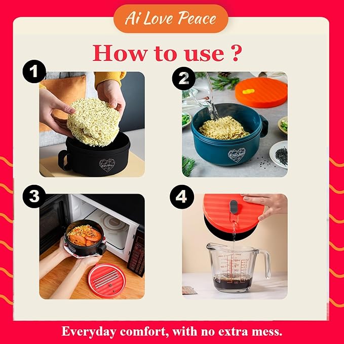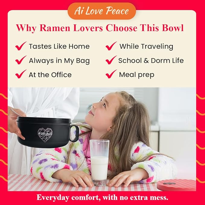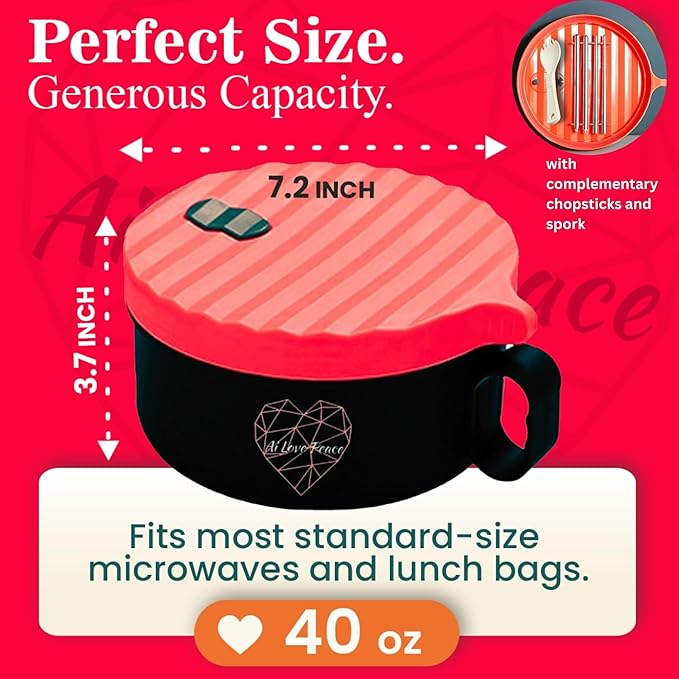 AI LOVE PEACE Ramen Bowl, 40 oz Microwaveable Noodle Cooker for Ramen, Pho, Soup, and Pasta, Dishwasher Safe and Portable, Ideal for Home, Office, Dorm, or Gift (Red)