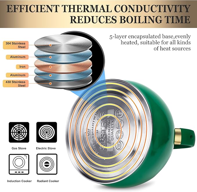 SUSTEAS Stove Top Whistling Tea Kettle - Food Grade Stainless Steel Teakettle Teapot with Cool Touch Ergonomic Handle, With 1 Silicone Pinch Mitt Included, 2.64 Quart (Green)