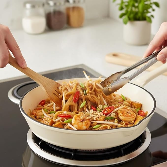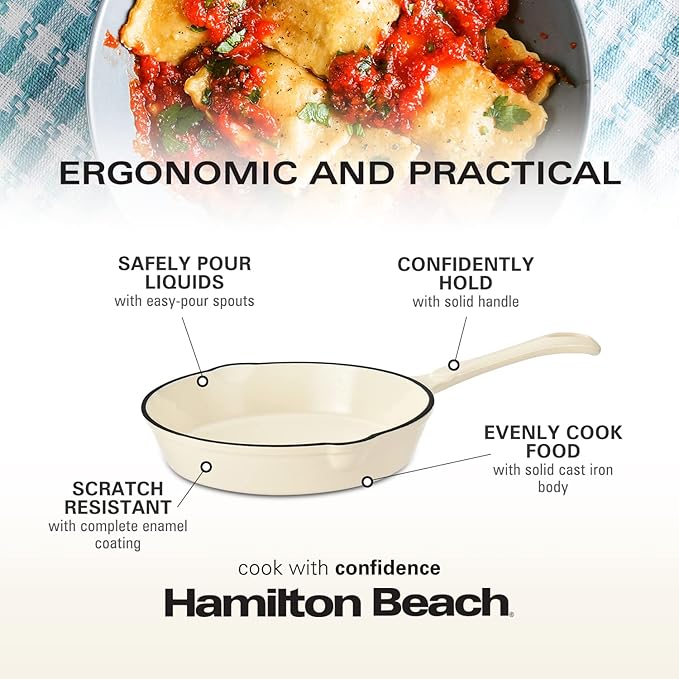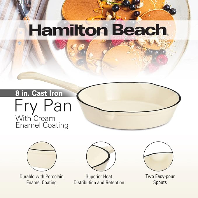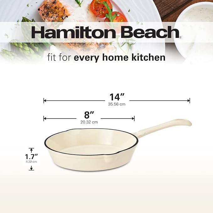 Hamilton Beach Enameled Cast Iron Fry Pan 8-Inch Cream, Cream Enamel Coating, Skillet Pan for Stove Top and Oven